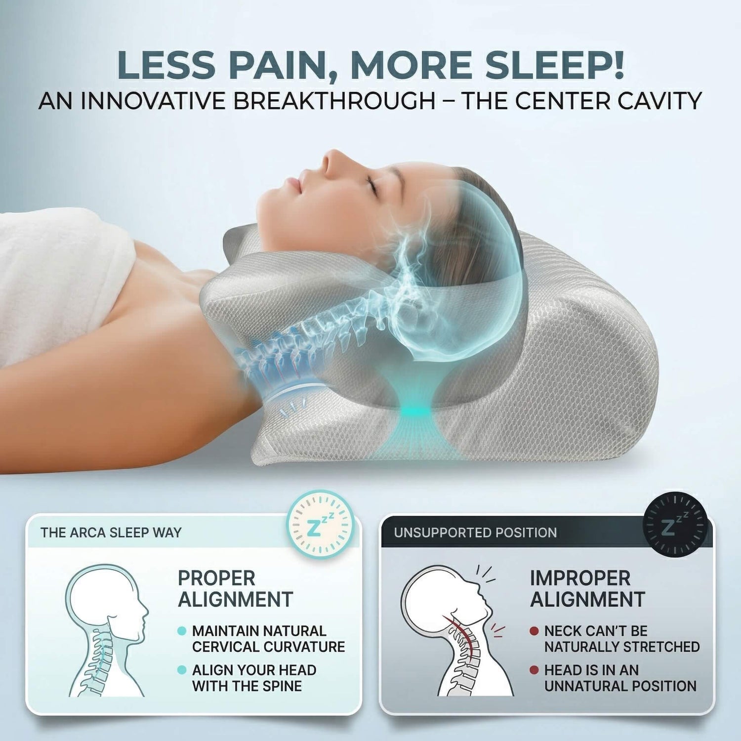 The ArcaAlign™ Difference: The meticulously designed Center Cavity maintains your natural cervical curvature, allowing your neck to stretch naturally and perfectly aligning your head with your spine for deep, restorative sleep.