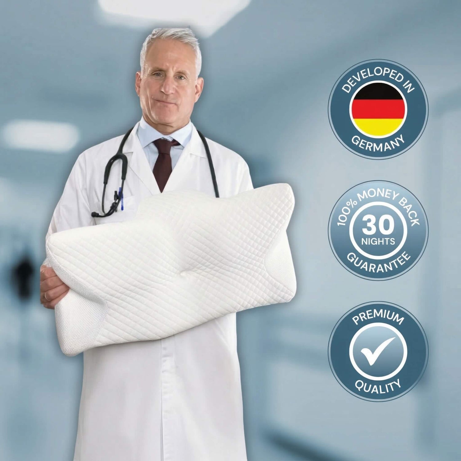 ArcaAlign™: The hollow center cavity perfectly cradles the skull, reducing ear and head pressure while maintaining the natural curve of the neck.